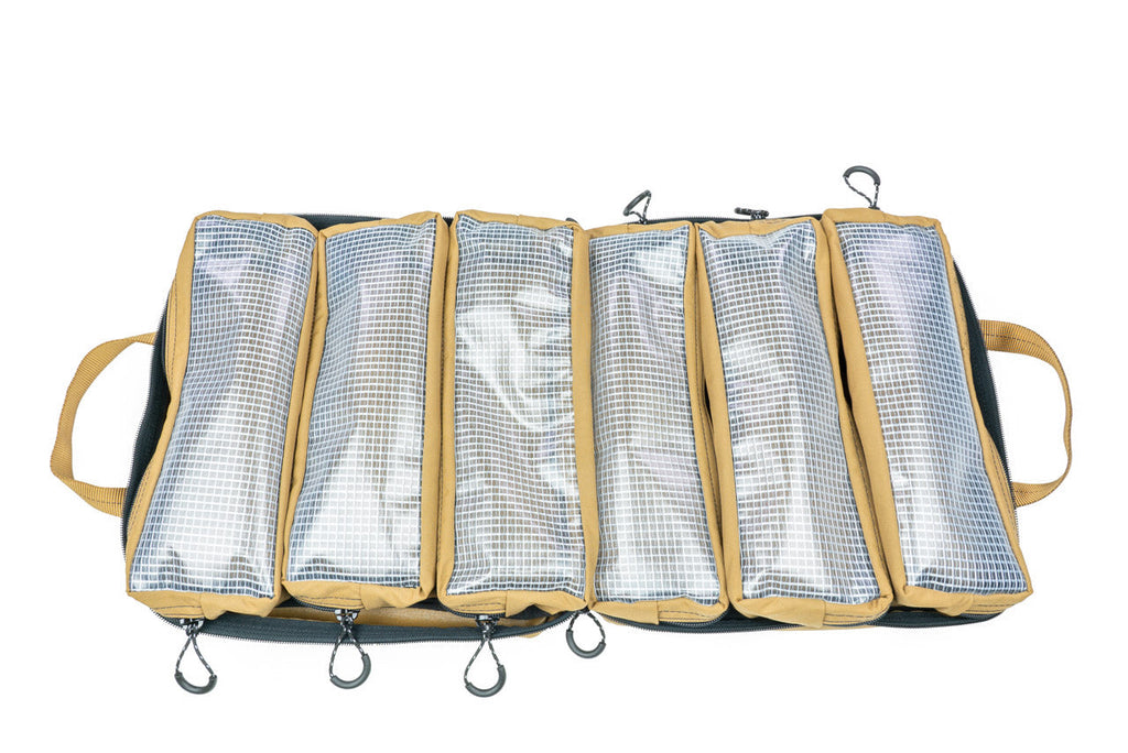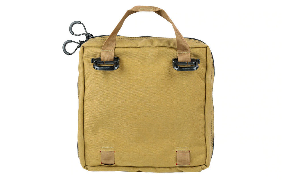 Our newest generation of tool storage features extra-tough 1000D Cordura fabric and integrated handles. This bag has a MOLLE-compatible ladder system front; cut from a single piece of double-layer Squadron fabric. We've also added a sleek-looking, hi-vis orange layer beneath the MOLLE Panel.
