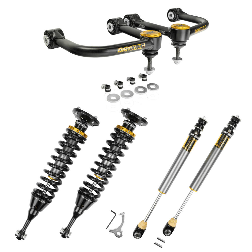 Transform your Tacoma by eliminating front-end rake and achieving a leveled lift with the Dirt King MT Trail Runner Kit. This cost-effective solution includes Dirt King's 4130 Upper Control Arms, 2.0 IFP Front Coilovers, and 2.0 IFP Rear Shocks—all expertly tuned for superior comfort during everyday driving and on rugged trails. It's the perfect choice for those looking to enhance their vehicle's appearance and ride quality without the premium price tag of an extreme off-road package. For unmatched off-road control, adjustability, and high-speed desert capability, consider our MT PreRunner Kit.