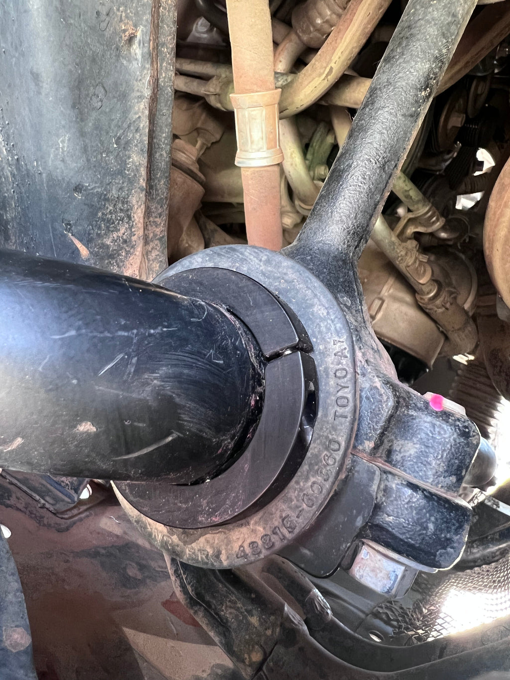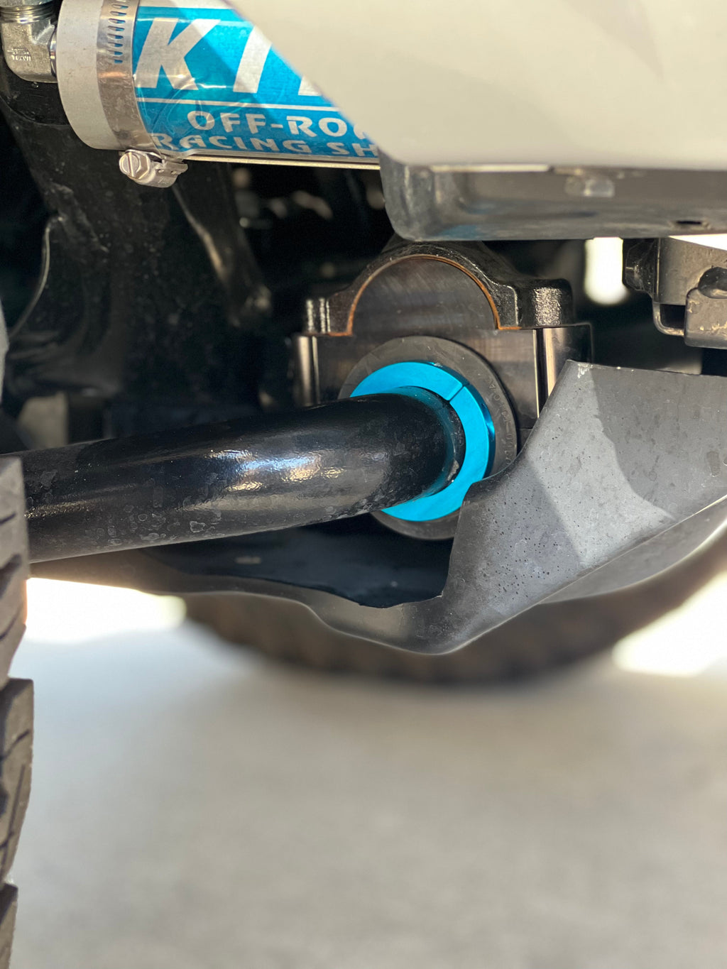 From the factory, to keep the sway bar from shifting to either side, Toyota uses a combination of rubber straps (glued and band-strapped) and pressed-on metal straps on each end. Any driving outside of normal daily driving will cause those straps to eventually fail. Depending on the situation (mainly off-roading), too much articulation can cause the sway bar to shift over way too much to one side which can result in the KDSS shock body making contact with the frame.