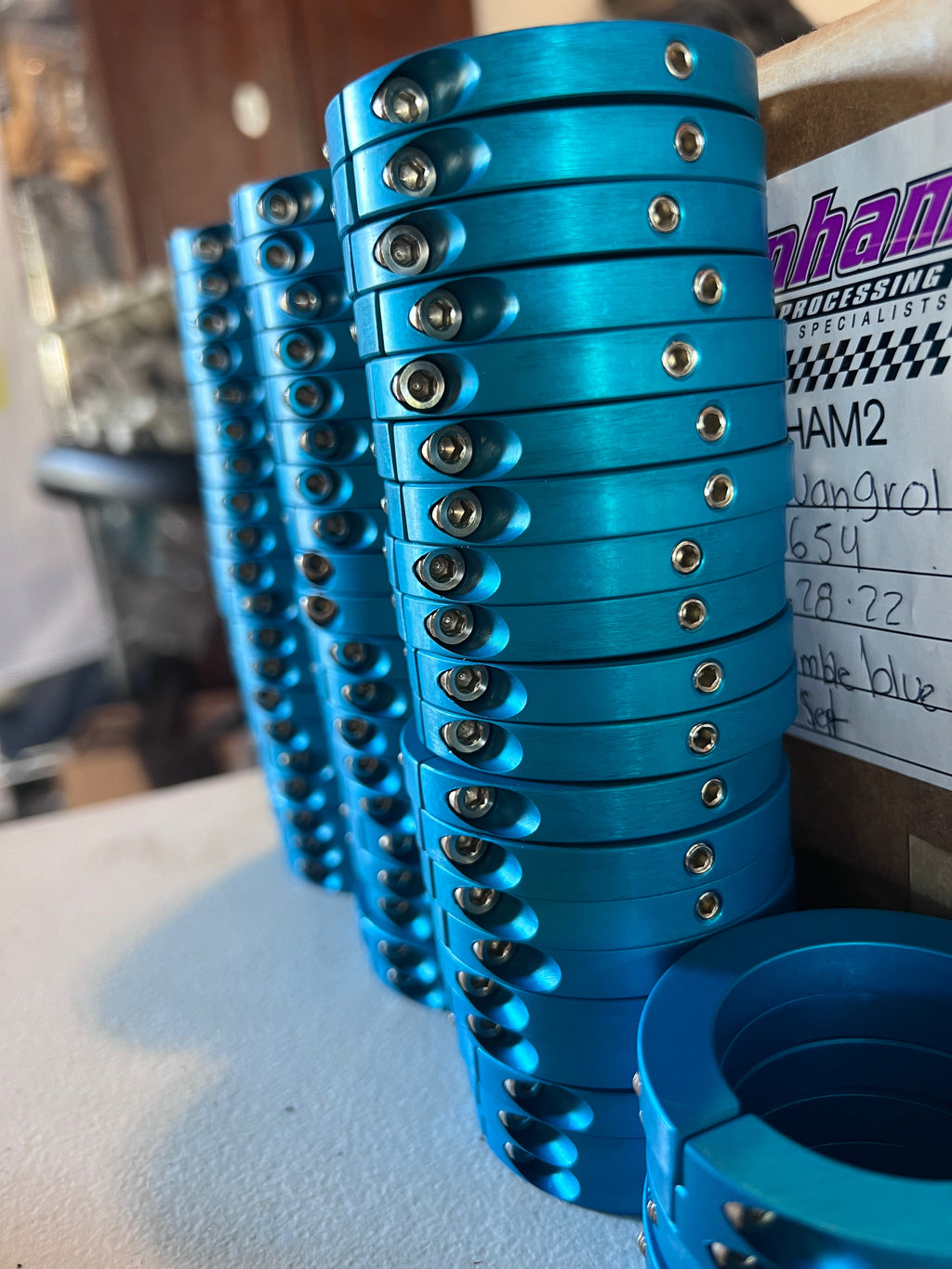 KDSS front sway bar billet clamps - Comes in 6061 aluminum, sold in pairs. Most will need just clamps on the outsides (1 pair)at the bend. Adding the clamps to the inside of the hard link and KDSS shock (2nd pair) make it so much more stronger, especially over the pressed on metal strap from the factory. This method also gives you the opportunity to cheat the system a little by centering the sway bar even more and not being limited by the pressed on metal straps from factory.