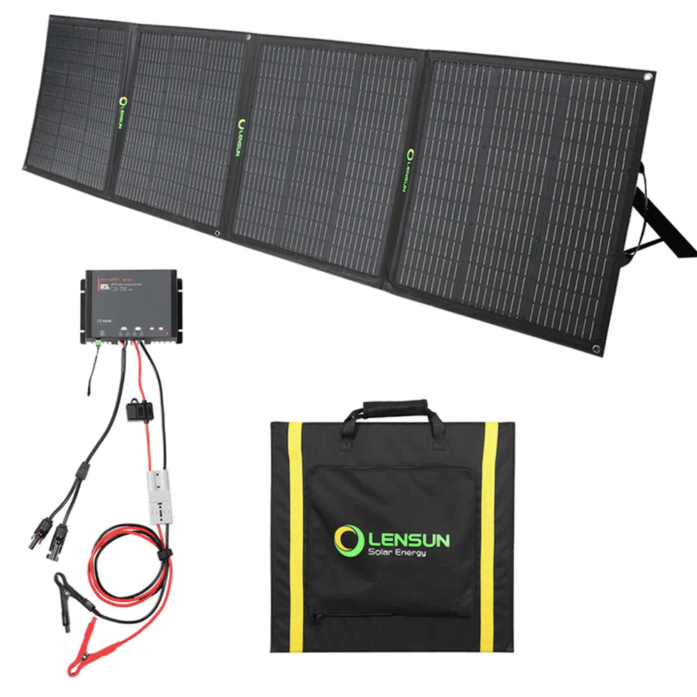 The Lensun 200w foldable solar panel is made of 4pcs 50w solar panels, 5m/16ft cable with solar connectors, 20A Waterproof MPPT solar controller, battery clips, Ready to charge AGM, GEL, and Lithium battery!