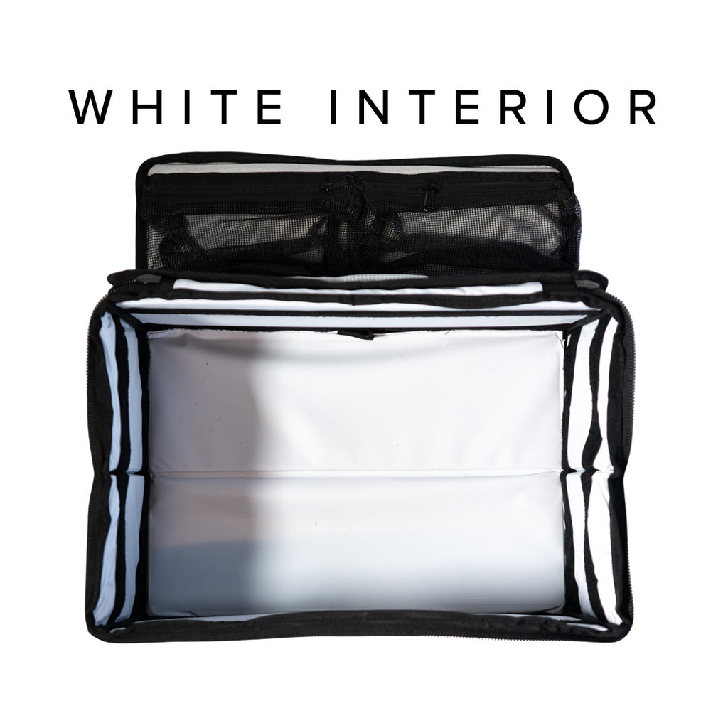 The main compartment features a white interior lining that makes it easy to see your gear—even at night with just a headlamp—while also being simple to wipe down and keep clean. -