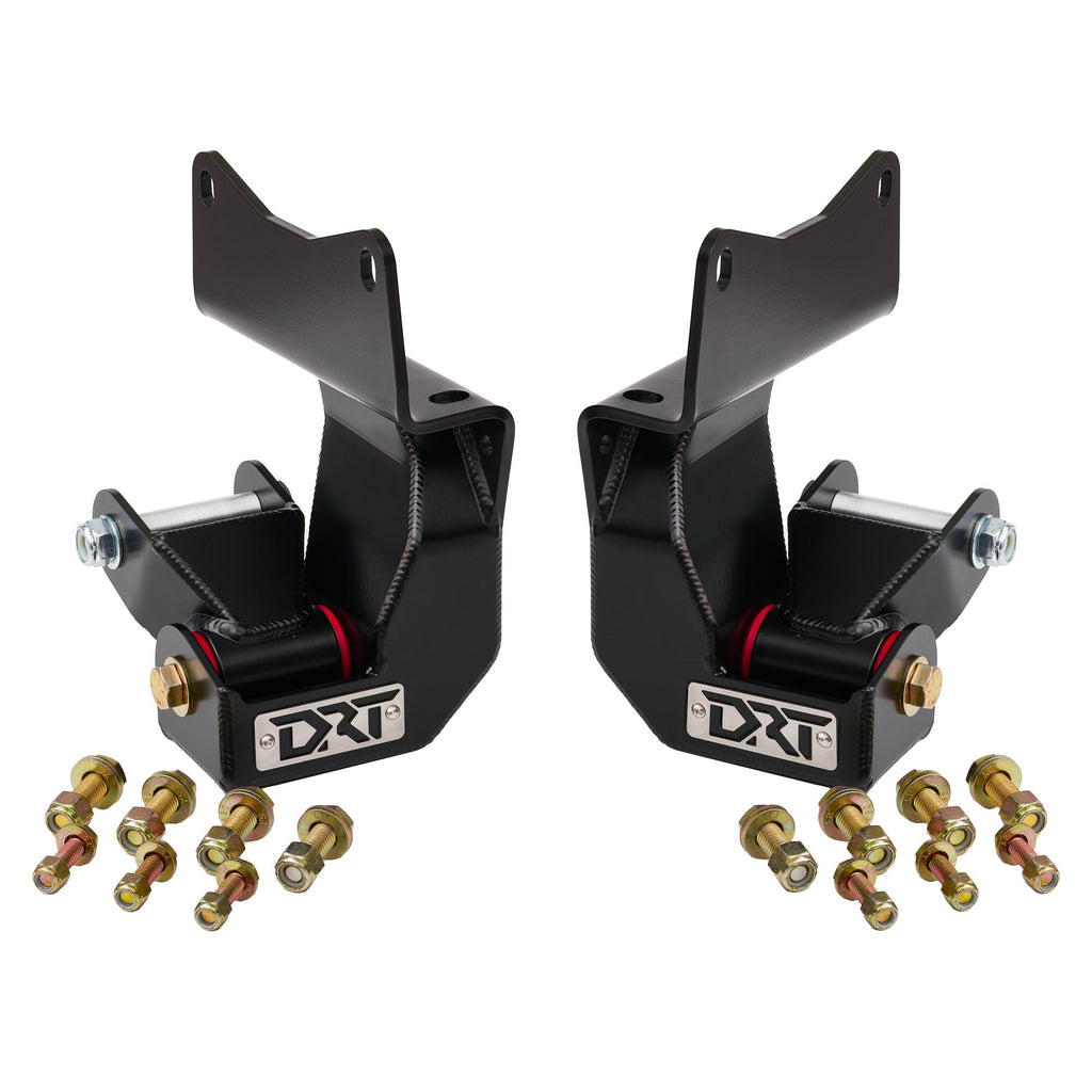 Our DRT hangers are engineered to eliminate these issues by stiffening the mounting points, improving geometry, and allowing aftermarket leaf springs to cycle cleanly through their travel. The shackle pivot is moved back to optimize suspension performance and unlock the full potential of long-travel leaf springs.