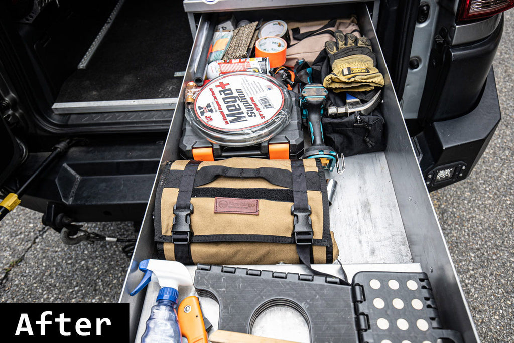 Outside, you’ve got rows of MOLLE mil-spec webbing for your big guns — breaker bars, wrenches, etc. It buckles up tight, straps to a rollbar, and has a tough handle for grab-and-go greatness. It also lies flat for full tool visibility, because digging blindly is so last season.